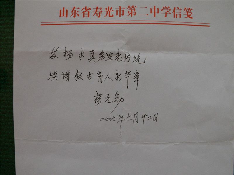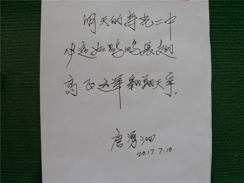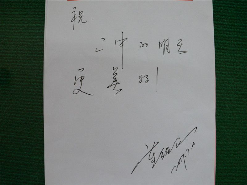 座谈会最后,各位校长书记为二中新校倾情题辞:“发扬求真务实老传统,续谱教书育人新华章”(杨元勋书记题);“明天的寿光二中必定如鲲鹏展翅,高飞远举,翱翔天宇”(唐涌泗校长题);“二中的明天更美好”(董绳民校长题)。一句句真诚的话语包含了各位老领导对二中的浓厚深情和对学校未来发展的深切祝福,对全校师生来说更是一种莫大的鼓舞和鞭策。我校悠久的办学历史、辉煌的办学业绩凝聚着数代二中人薪火相传、锐意进取、精益求精的心血,更渗透着历届学校领导班子勇于担当、科学决策、身体力行的汗水。风雨磨砺六十载,再展宏图须从头,全体二中人应牢记重托,在“合作成就未来”的校训和“精诚合作,负重致远”的学校精神指引下,携手并肩,奋力拼搏,共同描绘学校更加辉煌灿烂的美好明天!