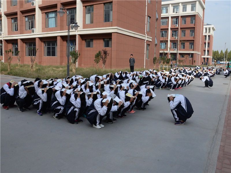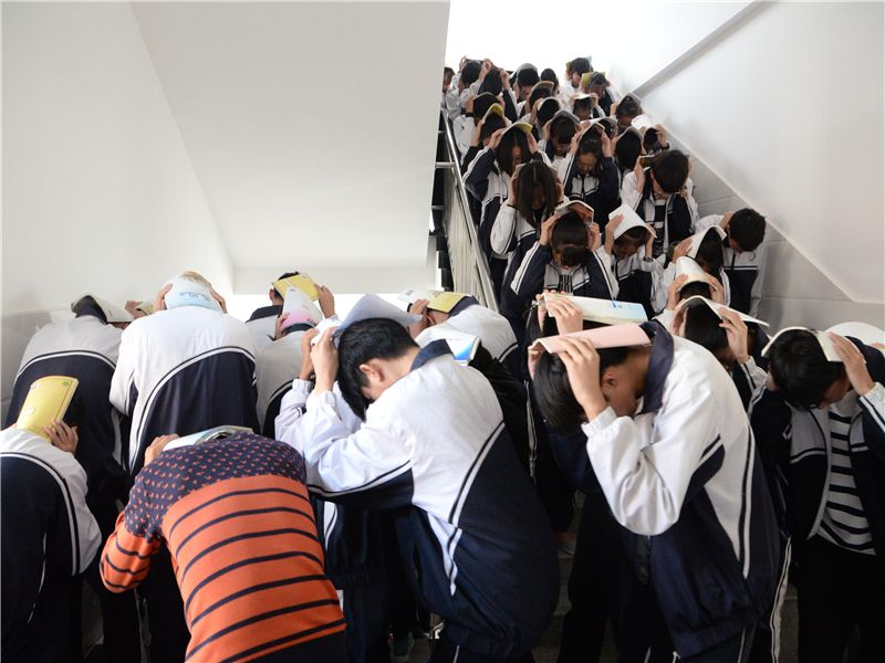 演练开始前,张法山主任通过广播向学生们全面讲解了地震知识,以及地震来临时避险自救的方法。随着警报声响起,所有学生双手抱头躲避在课桌底下,待平稳后,所有学生将课本放在后脑勺处,低头,弯腰,降低重心,迅速离开教室,有秩序从楼梯处撤离。到达目的地后,各班主任立即清点人数,向级部主任汇报,级部主任再向总指挥张法山主任汇报。