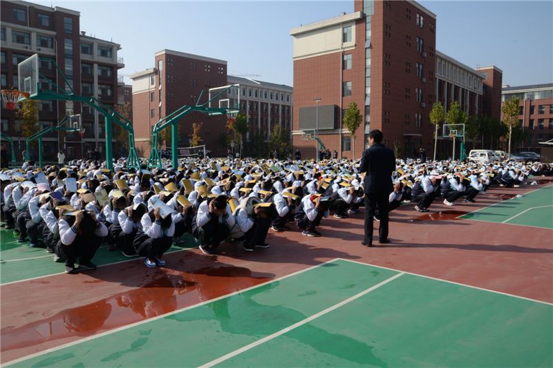 演练开始前,学校安保科张法山主任就演练的时间、路线、内容、对象等作了具体的说明,同时对这次演练的具体操作程序、疏散要求与注意事项一一作了讲解。随着一阵急促刺耳的警报声响起,各班班主任立刻组织学生们按平时演练的要求在班内展开自救,他们有的用胳膊护住头部,有的钻到桌子下,有的蹲在墙角边。当第二次报警声响起时,各班老师迅速组织本班的学生按规定的逃生路线向学校篮球排球场安全区域集合。全校师生从教室撤离到安全区域只用了2分16秒时间,整个演练过程既紧张逼真,又有条不紊。