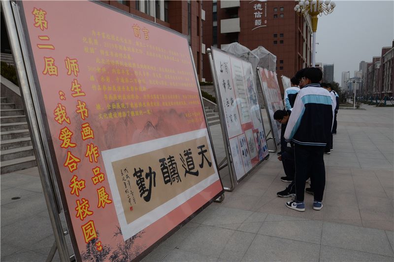 为丰富校园文化生活,彰显二中学子青春活力,营造我校“合和”文化氛围,在2019年新春到来之际,我校在大德广场举办第二届“我爱合和校园”师生书画作品展。