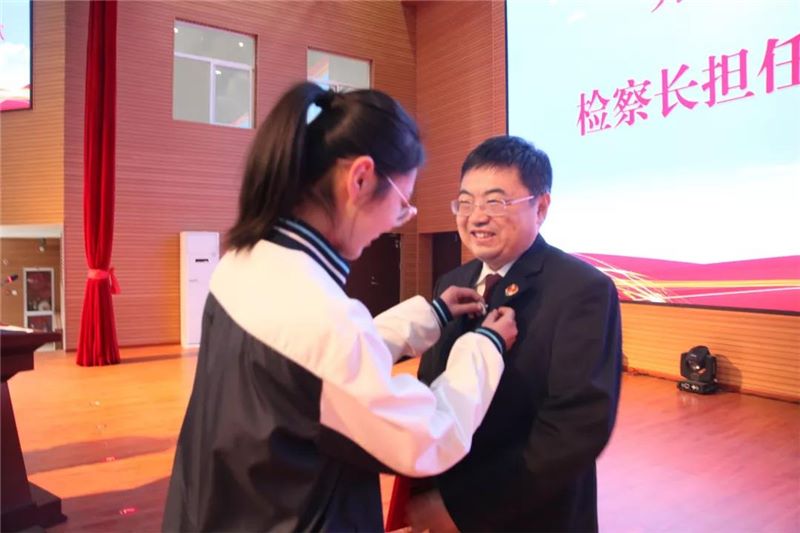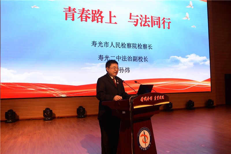 活动伊始,朱导泉主任简要介绍了近年来寿光教育系统在深入开展法治宣传教育等方面取得的成效,并向一直以来大力支持教育系统普法工作的市检察院等部门表示衷心感谢,希望广大学生能够学法、懂法、用法、守法,走好人生的每一步。随后,学校领导董建水为孙炜检察长颁发法治副校长聘书,学生代表为其佩戴校徽,孙检察长向我校赠送青少年法律系列图书。最后,孙检察长从青少年应知应会的基本法律知识、以案说法之校园欺凌、青少年毒品问题及预防等五个方面作了题为“青春路上,与法同行”的精彩报告。