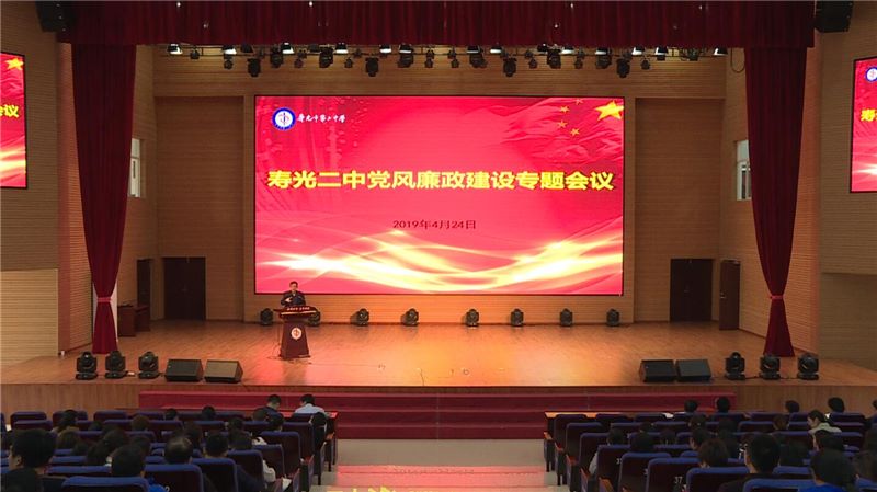 4月24日下午,寿光二中在智厅大报告厅召开党风廉政建设专题会议,学校领导董建水传达市教体局党风廉政建设暨警示教育专题会议精神,学校全体教职工参加。