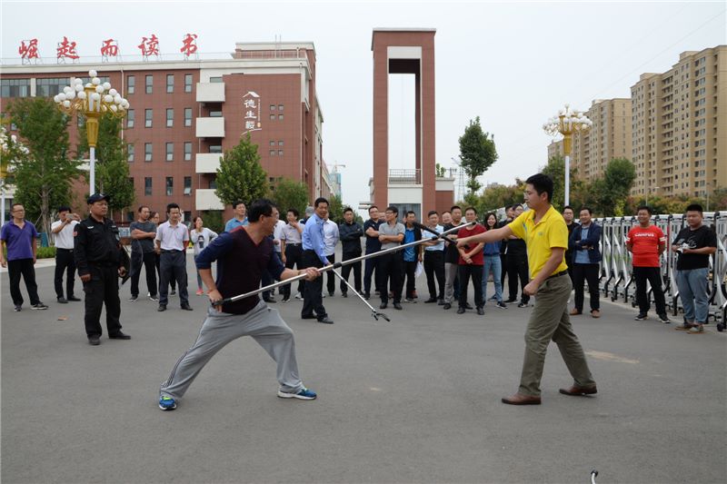 在培训现场,张怀生副书记向四支防暴应急队发放钢叉、脚叉、防暴盾牌、辣椒水等防暴器材,要求大家要对安保器材实行严格管理,合理使用,确保校园安全和稳定。