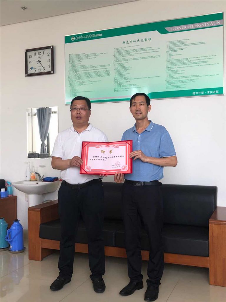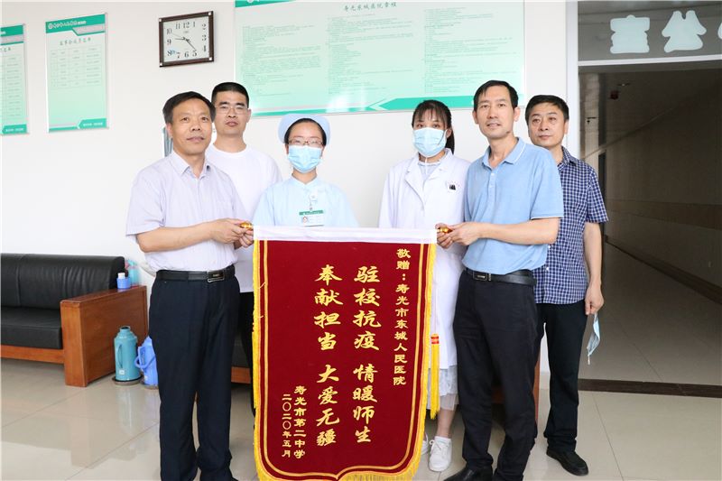 6月11日上午,我校校长董建水、副校长王立武一行来到寿光市东城人民医院,将一面写有“驻校抗疫,情暖师生,奉献担当,大爱无疆”的锦旗送到杨荣国院长手中,以感谢在疫情封校期间医院医护人员对学校师生健康的呵护。