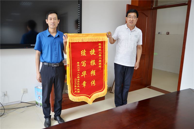6月29日上午,在距离2020年高考仅剩8天的日子里,我校83级校友代表刘福昌、马思敏来到学校,代表83级全体校友向母校赠送锦旗,祝福母校“2020年高考捷报频传、续写华章”。学校校长、党委书记董建水、副书记张怀生等会见了两位校友,并代表学校接受锦旗。