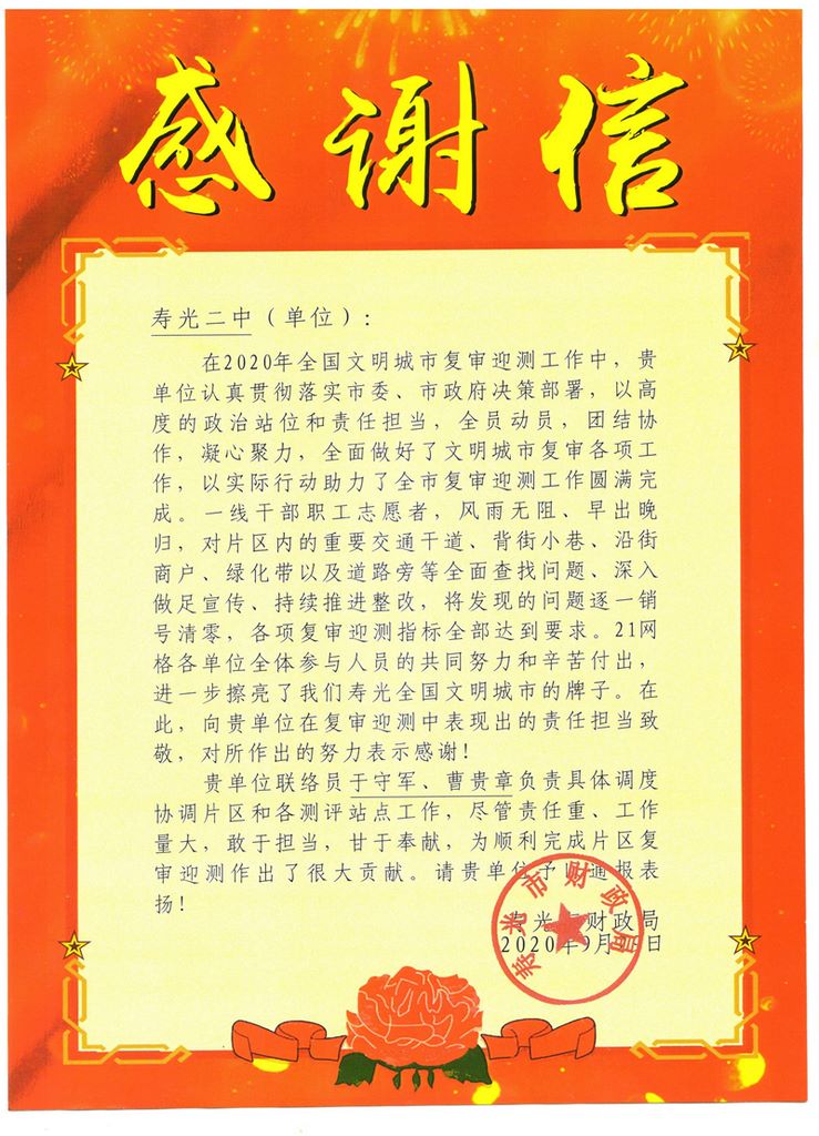 “在2020年全国文明城市复审迎测工作中,寿光二中认真贯彻落实市委、市政府决策部署,以高度的政治站位和责任担当,全员动员,团结协作,凝心聚力,以实际行动助力全国复审迎测工作圆满完成……”近日,我校收到了全国文明城复审迎测21网格主网格单位寿光市财政局送来的一封感谢信,高度评价我校教职工在2020年全国文明城市复审迎测中表现出的责任与担当。
