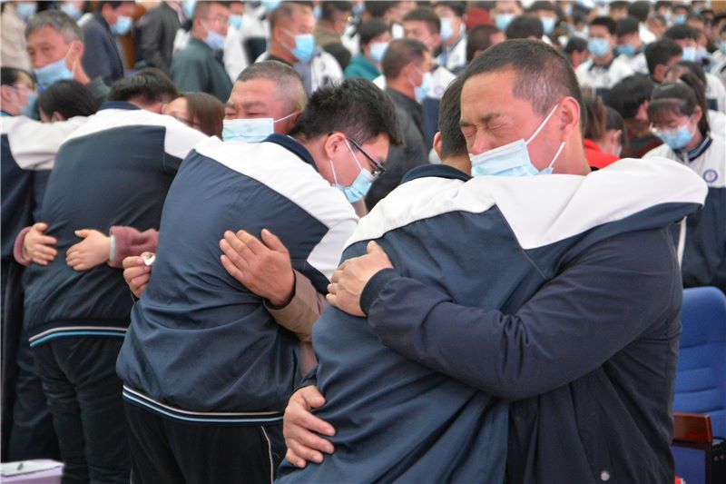 国歌嘹亮,不忘初心。雄壮嘹亮的《义勇军进行曲》在会场响起,歌声震彻会场,气势磅礴如虹,唤醒了在场每一位学子的理想和初心。高中三年,900多个日日夜夜,凝聚了父母无尽的牵挂,在冲刺高考的关键时刻,家长们也被邀请到现场,为学子加油助威。当学生与家长将凝聚着浓浓爱意的亲子信件相互交换后,此时的报告厅,处处流淌着催人泪下的感人画面:学子们紧握信件,拥抱着父母潸然泪下;父母一边读信一边擦拭眼泪,字里行间都能感受到孩子们的成长与成熟、坚强与担当。唯有拼搏、唯有奋斗才能不负父母,不负青春。