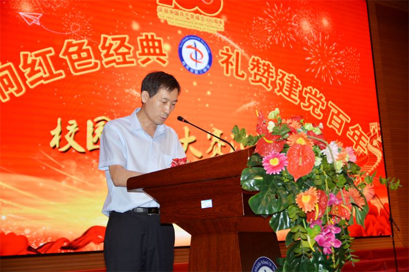 汇报演出在庄严的国歌声中拉开帷幕,随后董建水校长发表讲话,在中国共产党百年华诞之际,他希望同学们放开歌喉,以饱满的热情、嘹亮的歌声,唱响新时代的主旋律,展示我校学生的青春风采,用歌声来抒发对党、对祖国、对人民的无比热爱之情,用歌声来表达我们的理想信念,用歌声来抒发我们的壮志豪情!