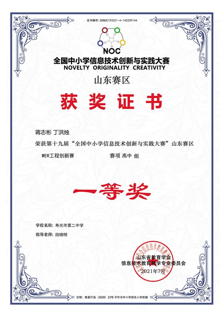 第十九届全国中小学信息技术创新与实践大赛(山东赛区)决赛成绩近日揭晓,我校有8名同学参加比赛,8人全部获奖。陈国庆、单星恺、丁洪烛、范俊凯、桂鑫慧、蒋志彬 6人荣获WER工程创新赛山东省一等奖并晋级全国决赛,侯智杰、刘依璠获得山东省二等奖。