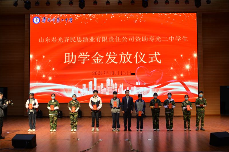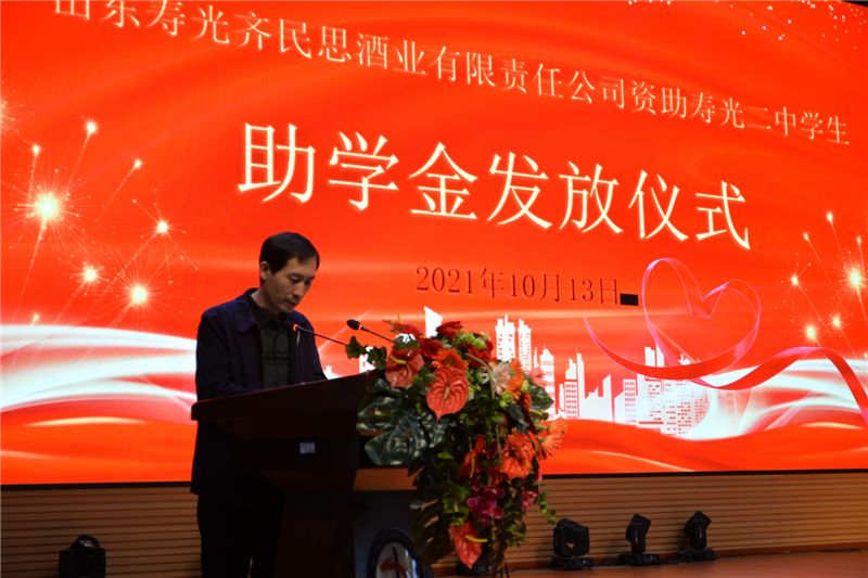 10月13日下午,山东寿光齐民思酒业有限责任公司爱心助学仪式在寿光二中举行。齐民思酒业总经理王金海、寿光二中校长董建水等出席活动,捐助活动由副校长杨风杰主持。