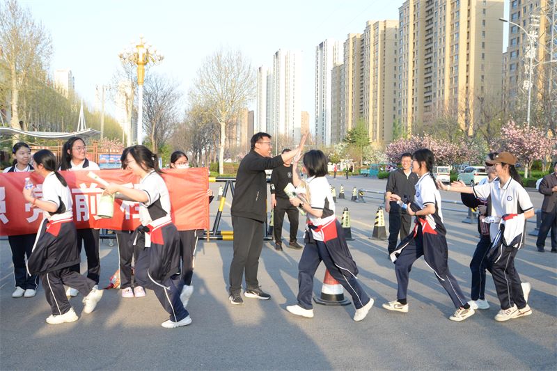 一路上,每个交通路口都有交警、教师志愿者提前等候,指挥交通,以确保学生安全通过;学校医务室的医生全程跟随,为中途身体不适的同学提供帮助,后勤保障部门备好桶装水,确保同学们饮水充足。
