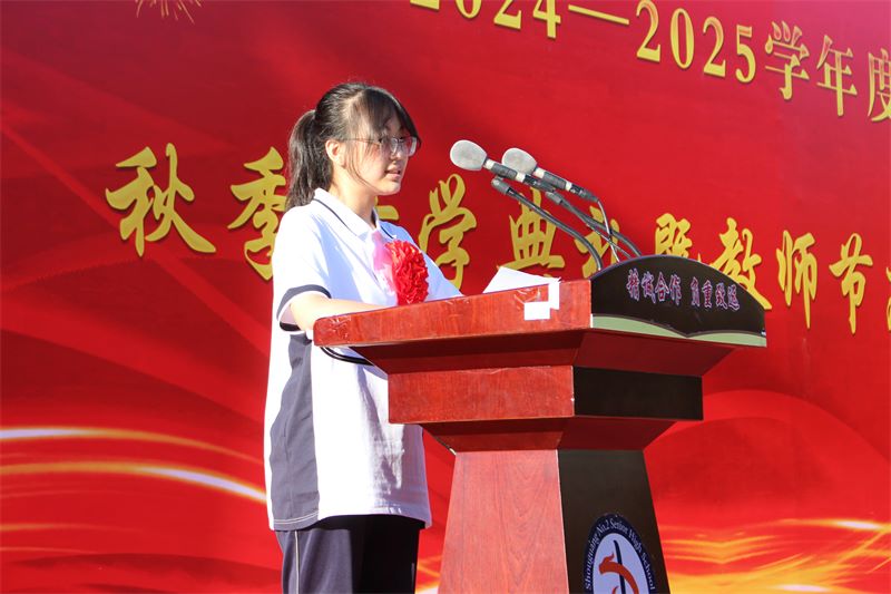 “老师们,同学们,选择了二中,也就选择了敢为人先与拼搏图强;选择了二中,也就选择了追求卓越与创造辉煌。勇者无畏,智者无敌,让我们手相牵,心相连,不懈追求,挥洒生命激情,释放青春热量,合力续写二中新的更大的辉煌!”韩晓梅作为教师代表发言,字里行间表达了对教育事业的热爱和对学生的深情厚谊。