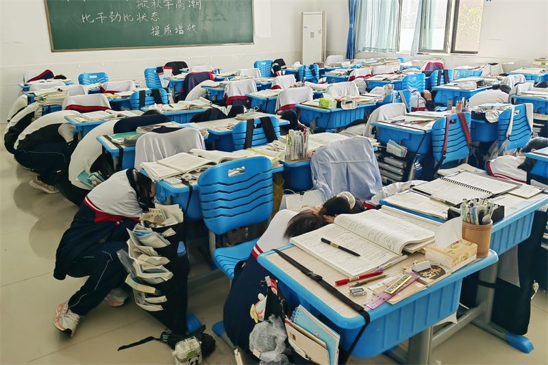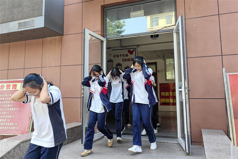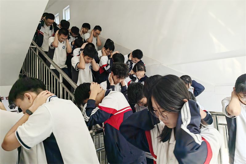 演练前,各年级相关负责人就本次演练的时间、路线、具体操作程序、疏散要求与注意事项作了具体的说明。随着第一次急促的警报声响起,在班主任老师的组织下,同学们用胳膊护住头部,有的钻到桌子下,有的蹲在墙角边,利用教室现有设施迅速采取自救措施;当第二次报警声响起,值班教师迅速组织本班学生按照规定逃生路线有序地向教学楼外撤离疏散,并在学校篮排球场、大德广场安全区域集合,所有学生从教室撤离到指定安全区域只用了2分40秒。活动中,各岗位人员尽职尽责,学生疏散有序、迅速,整个过程组织严密,疏散演练取得了圆满成功。