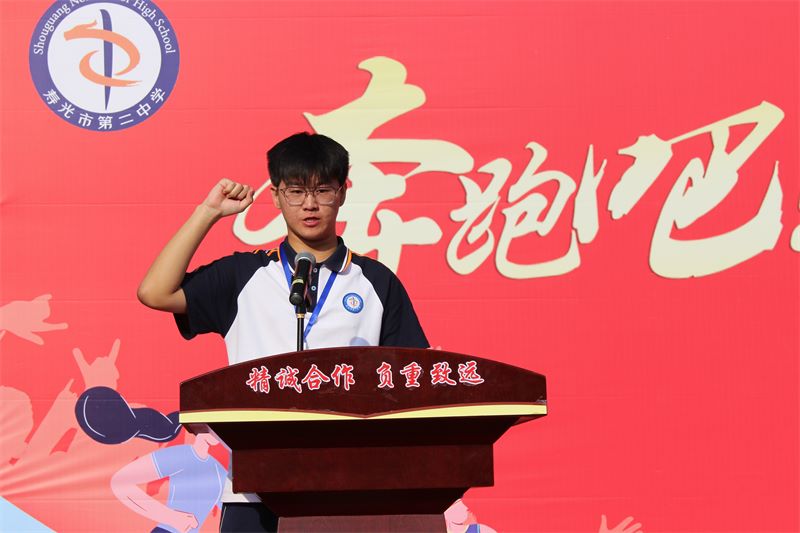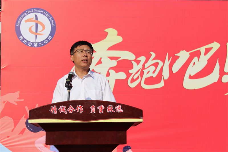 庄严的升旗仪式结束后,寿光二中党委书记张建波发表讲话,他希望全体师生以高昂的斗志和顽强的精神,安全参赛,文明参赛,赛出风格,赛出水平,完美诠释“精诚合作、负重致远”的二中精神,夺取体育比赛和精神文明的双丰收。张书记的谆谆教诲,让在场所有师生热血沸腾。