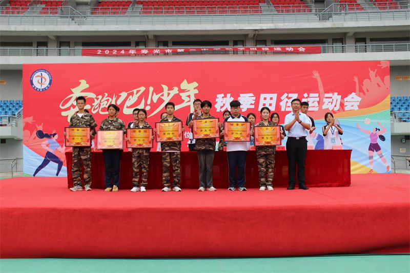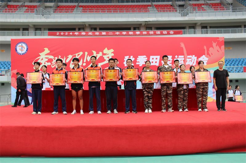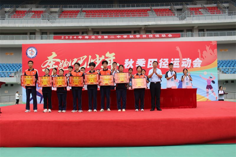 本次秋季田径运动会,成为同学们尽情展示才华、增进友谊、磨炼意志的大舞台,真正践行了寿光二中“以人为本、全面发展”的办学理念,取得了体育竞技和精神文明的双丰收。总裁判长赵振林宣布此次运动会比赛成绩,其中2024级4班在男子组4×100米接力决赛中,以48秒45的成绩打破了校运会纪录;2024级4班李承责同学在200米决赛中以24秒71的成绩打破了校运会纪录;2024级6班信泽宇、19班李昶昊、9班王伟程、14班孙树林、5班王伟琦、13班单勇亮等同学在男子5000米比赛中一并打破校运会记录,实现新的突破;2023级14班、12班、1班,2024级14班、15班、11班分获年级团体总分前三名,12个班级荣获体育道德风尚奖。