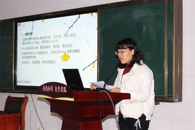语文学科备课组长李瑞萍老师从制约本次成绩的因素及后期工作打算等方面对语文教学进行了分析;数学学科备课组长周奎伟从学生答题情况和教学启示等方面对数学教学进行了深入分析;英语学科备课组长王文慧对各班阅读理解、七选五、小作文等得分情况进行分析,针对问题,继续强化高频词汇积累、加强阅读训练;物理学科备课组长冯永庆从错题错因分析、课堂存在问题等方面对物理教学进行了反思;化学学科备课组长张迎春对制约成绩的因素进行了重点分析;生物学科备课组长于永峰重点介绍了试卷得失分情况和下阶段教学措施;政治学科备课组长祝继玲着重强调了加强专题训练、提升学生应试能力的重要性;历史学科备课组长杨文娟从试卷错题分析、改进措施等方面进行了分析;地理学科备课组长王建业对出现的问题进行了分析,对后期工作计划和措施进行了重点说明。