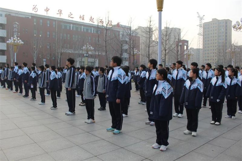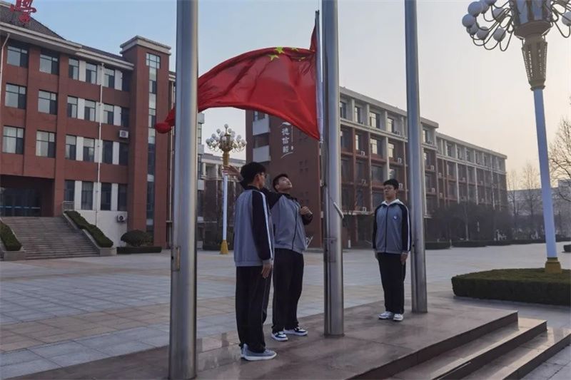 7:10,在庄严的国歌声中,鲜艳的五星红旗冉冉升起,全体师生肃立注目,以崇高的敬意表达对祖国的热爱。