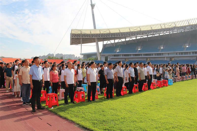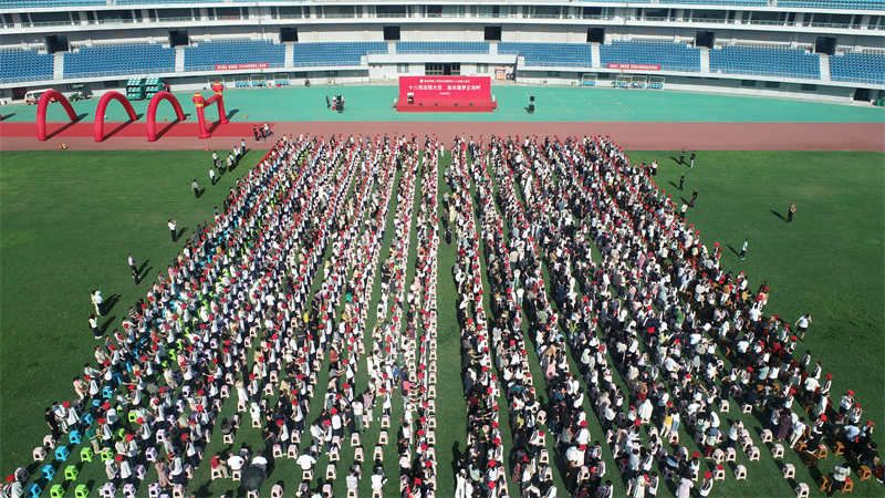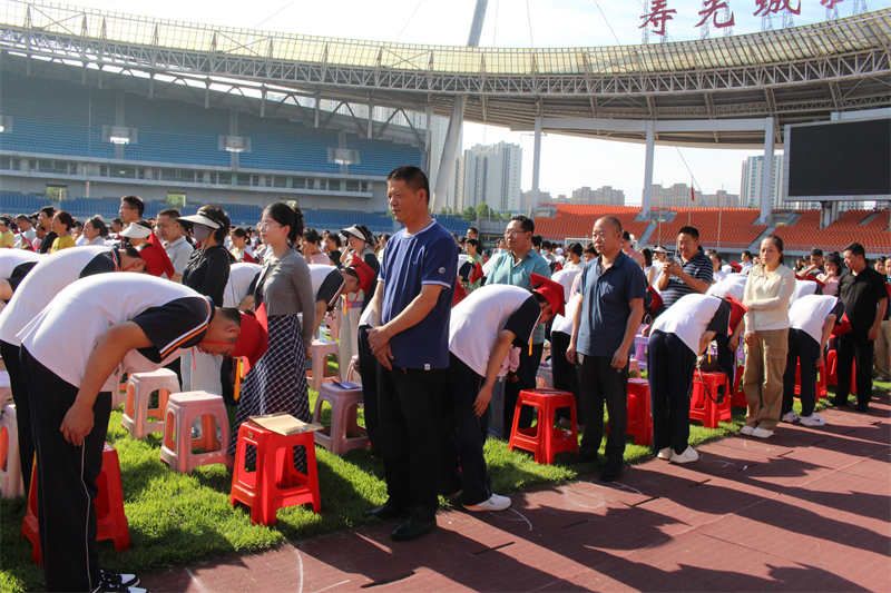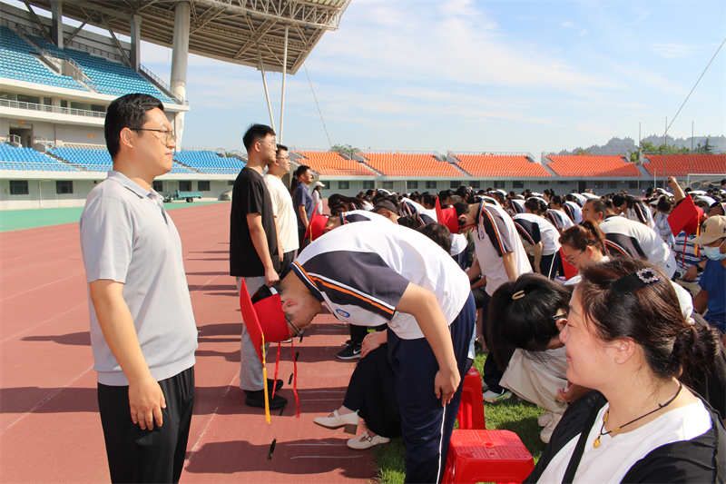有这么一群人,虽与我们非亲血缘,却以父母般的热忱守望成长。他们将渊博学识化作春风化雨的讲解;他们以言行在岁月中镌刻成知识的方圆,把处世哲思酿成循循善诱的箴言。这群被称作“老师”的人,于三尺讲台前织就天下最崇高的经纬,当是人间最该被铭记的星辰。学子们将右手贴紧心口,目光里翻涌着感谢师恩的回响。“老师您辛苦了!”“我们永远感谢您!”的声浪此起彼伏,胸腔共振的赤诚穿透整个体育场,随即学生们向老师深深鞠躬致谢。那弯下的脊梁里,深藏着对授业解惑的感恩,更有对“师者如光”的永恒致敬。