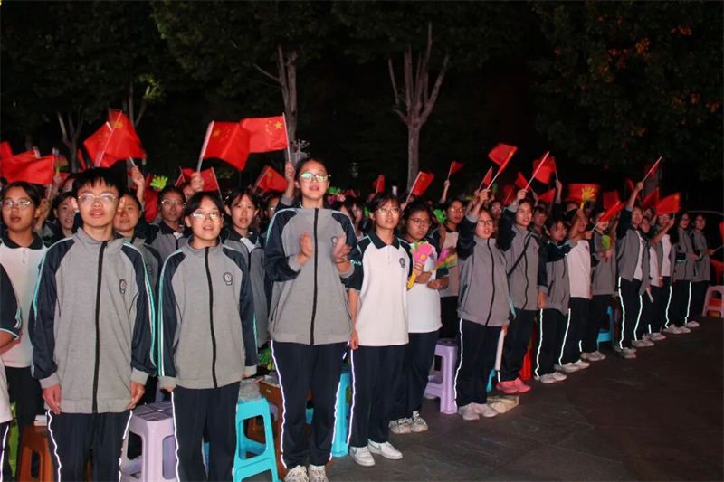 “五星红旗迎风飘扬,胜利歌声多么响亮,歌唱我们亲爱的祖国,从今走向繁荣富强……”当《歌唱祖国》那熟悉而激昂的旋律在夜空中奏响,整场晚会的气氛被推向最高潮。场上场下,三千余名师生肃然起立,手中挥舞的国旗瞬间汇成一片波澜壮阔的红色海洋。这一刻,歌声不再是简单的旋律,而是化作最炽热的爱国之情,激荡在每一位师生的心间。