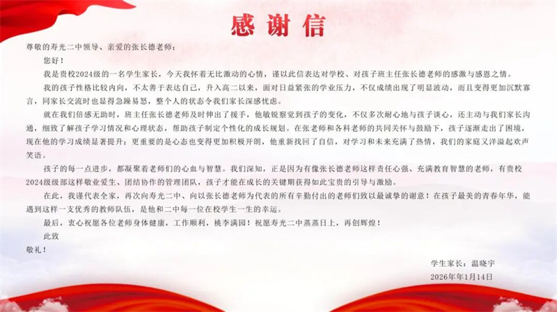 一面锦旗,一个故事,一份真情。它承载着家长对学校的感激与信任,彰显了寿光二中教师团队爱岗敬业、潜心育人的高尚师德,也生动诠释了家校同心、携手共育的深刻内涵。我们坚信,在广大家长的理解、支持与配合下,在全体教职工的共同努力下,寿光二中的教育教学工作必将迈上新的台阶,为培养更多优秀学子、成就更多栋梁之材贡献更加坚实的力量!