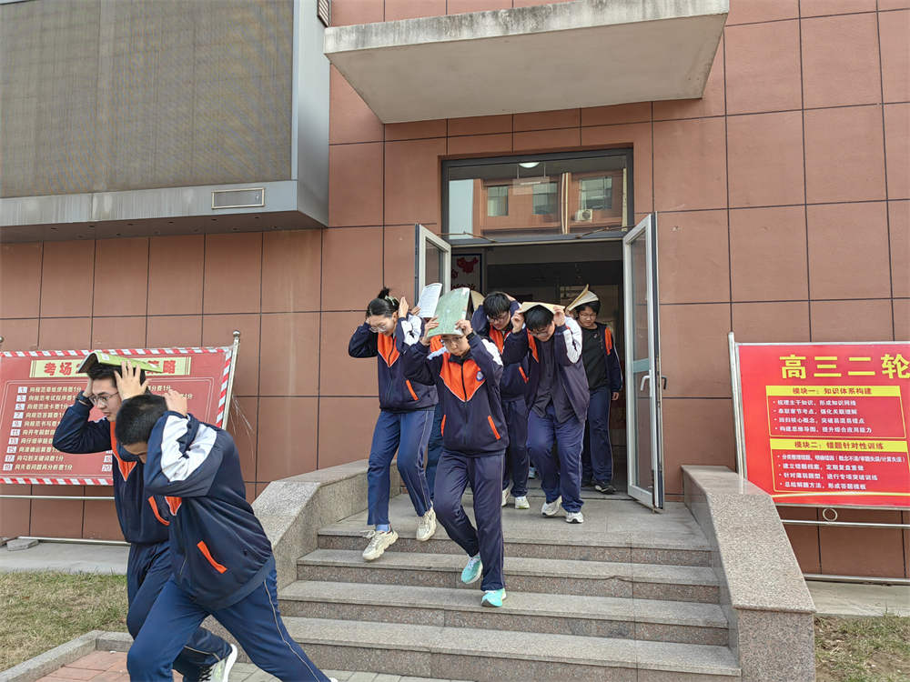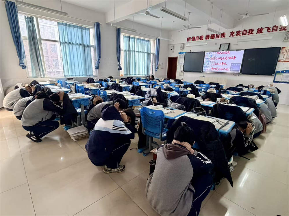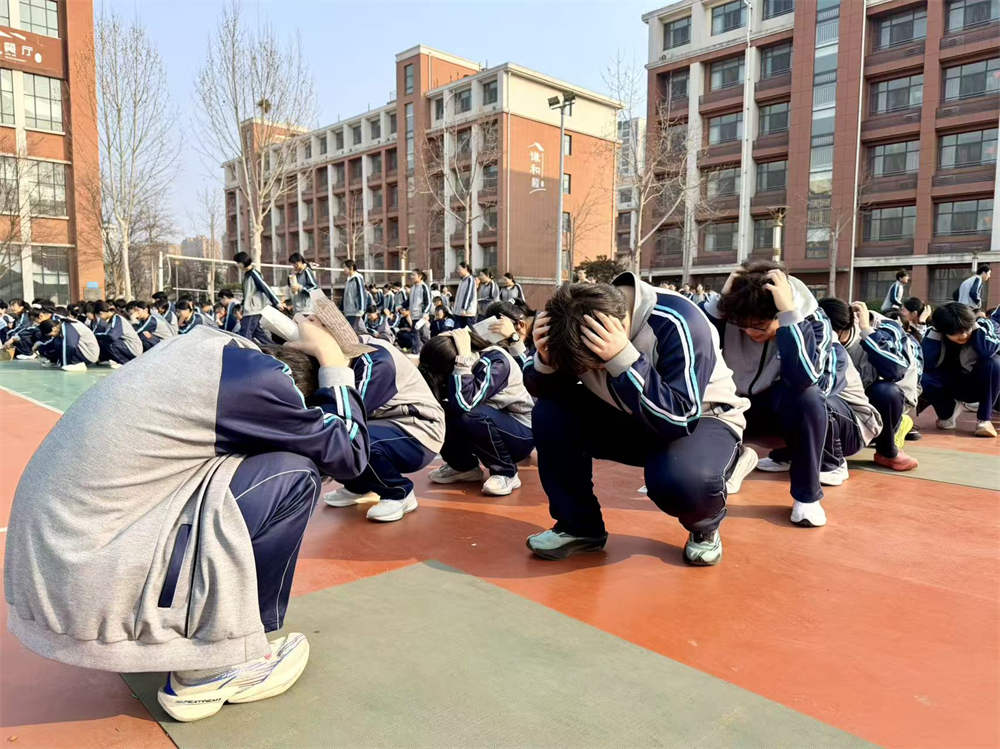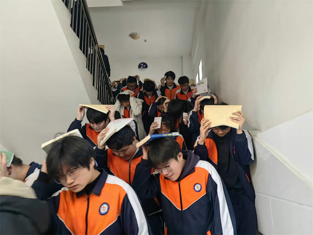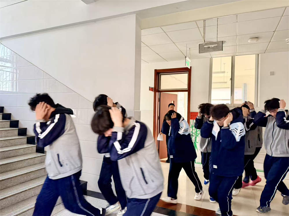随着第一声地震预警警报响起,演练正式启动。全体师生迅速进入应急状态。教室内,学生在老师的指导下,立即遵守“伏地、遮挡、手抓牢”的要求,迅速躲到课桌下方,尽量降低身体重心,用双手护住头颈,进行就地避险。与此同时,各职能组工作人员及安全岗教师迅速就位,在楼层关键点位值守待命。疏散指令下达后,各楼层安全岗教师立即引导学生沿预定路线快速、有序撤离教学楼,前往篮排球场、大德广场等指定安全区域集合。整个疏散过程路线清晰、规范有序,无拥挤、推搡现象。安全集结后,各班级第一时间清点并上报人数,确保不漏一人。演练中,各岗位人员尽职尽责,医疗救护、心理疏导、安全保卫等小组严阵以待,各年级疏散迅速、组织严密,达到了预期效果。