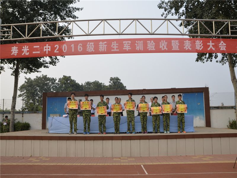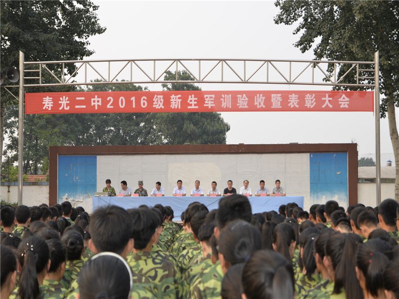 大会在庄严的国歌声中拉开序幕,艺体科杨春祝主任宣读寿光二中2016级军训内务整理优胜班级和会操比赛优秀班级获奖名单,并举行了隆重的颁奖仪式。接着,由高一新生代表孙丽洁同学发言,表达了对本次军训的感悟和对新学期生活的期望。随后,张国祥书记作军训总结报告,在讲话中张书记充分肯定了同学们在军训中表现出的顽强意志和团结合作精神,同时要求高一全体师生把军训中养成的军人作风保持下去,严于律己,培养正确的人生观、价值观。最后,夏发德校长宣布2016级新生军训验收暨表彰大会圆满结束。
