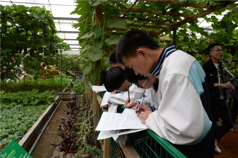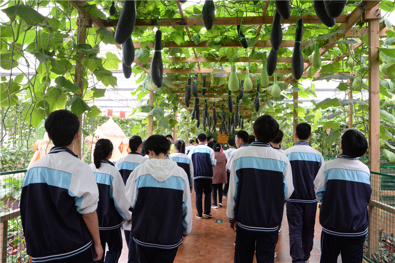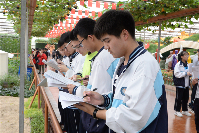 今年菜博会秉承“绿色·科技·未来”的主题,特色鲜明的展馆为同学们呈现出一道道精彩的绿色农业科技大餐:在8号馆内,“伟大复兴”、“创世追梦”、“红色丰碑”等十余个大型蔬菜景观,展现新中国成立70年来的辉煌成就和新时代、新精神的伟大创造,整个场景气势恢宏,内涵丰富,尽显绿色胜景与时代精神同频共振的蓬勃魅力,同学们或驻足观看,或合影留念,内心受到了极大的震撼;在7号馆、10号馆里,重达200多公斤的“巨人南瓜”、3米长的“特长丝瓜”、单株结果3000公斤的“西红柿树”令人啧啧称奇,潮汐栽培、浅液流栽培、气雾栽培、椰糠栽培、岩棉栽培等100多种国内外最前沿的种植技术、栽培模式,处处彰显出菜博会现代农业的气息,让同学们大开眼界。