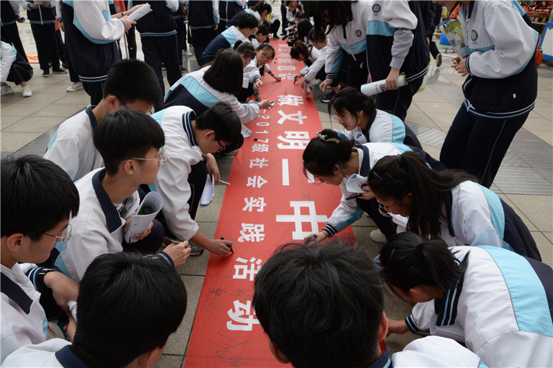 为进一步培养学生爱护环境、绿色环保的意识,全体同学还举行了“树立环保意识·做文明二中人”签名活动,2500余名同学以蓝天白云为凭,以菜博盛会为证,庄严写下自己的名字,从自身做起,从身边点滴小事做起,倡导绿色环保,遵守文明礼仪,用实际行动做一名出彩的寿光二中人。