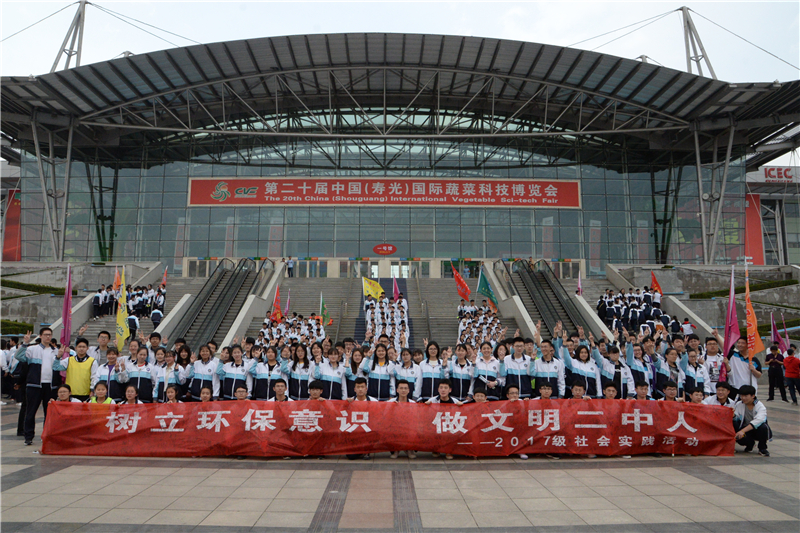 参观完菜博会展厅后,同学们还举行了一系列主题活动,尽展二中学子风采。在菜博会一号馆前的台阶上,一百五十名同学表演了手语《感恩的心》,以无声的手语表达内心对老师和家乡的感恩之心、自豪之情。为了筹备此次活动,老师们提前十天就开始了准备工作,规划活动路线,编写校本教材;在往返途中,学校领导和老师或前或后,或左或右,将同学们“裹在”一个个圈子里,确保每个学生出行安全;在参观菜博会的过程中,各班班主任或带队老师,当起了临时解说员和摄影师,让同学们了解了更多前沿的知识、留下了更多美好的印记。此次社会实践活动的成功举办,使同学们更加自豪于家乡发展的巨变,进一步坚定了莘莘学子肩负责任、励志勤学、报效祖国的青春梦想。
