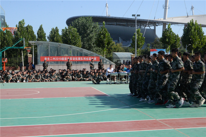 龙腾虎跃秋风劲,又是沙场点兵时。为检验军训成果,展现新生风采,8月30日上午,寿光二中2019级新生军事拓展队列会操比赛在学校篮排球场举行。一千多名新生以严整的军容、饱满的精神、昂扬的斗志,等待学校的检阅。上午7时30分,比赛正式开始,22个方队分别在各自教官的指挥下,依次展示了立正、稍息、四面转法、齐步、跑步等规定动作,同学们动作统一、口号响亮,以过硬的军事技术和良好的精神状态为六天的军训生活交出了一份满意的答卷,展示了二中学子积极向上的精神风貌。