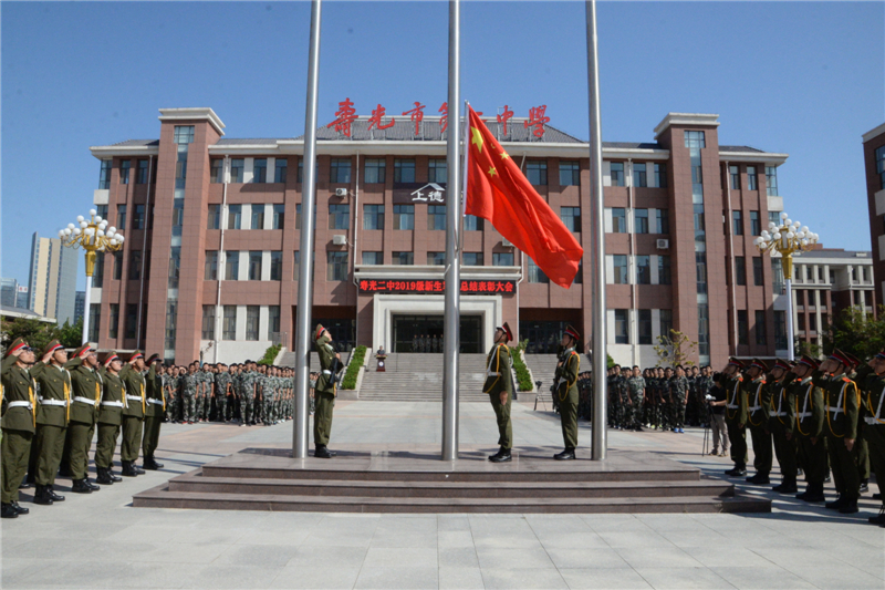 会操比赛结束后,2019级全体师生来到上德楼前,新生军训总结表彰大会正式开始:国旗护卫队的学生迈着铿锵的步伐,手擎鲜艳的五星红旗款款来到国旗台下,在激昂的《义勇军进行曲》中,在2019级全体师生的注目礼中,鲜艳的五星红旗徐徐升起,高高飘扬在二中上空。