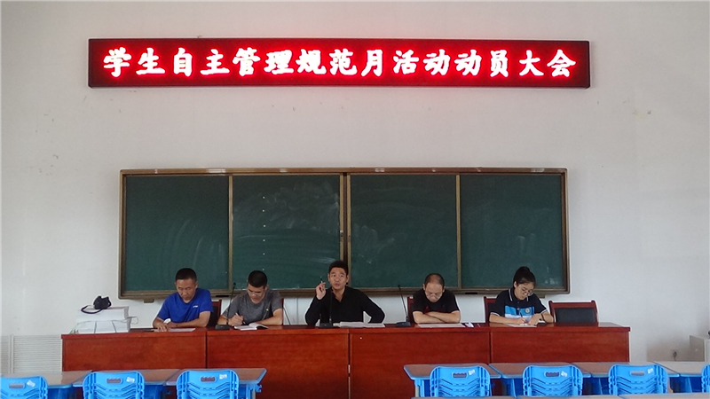 新学期,新起点,新面貌。开学伊始,为促进学生良好行为规范的养成,形成长期有效的管理机制,9月2日,寿光二中在智厅小报告厅举行自主管理规范月活动动员大会,学生处丁清源主任、曹贵章副主任、马纯奎副主任、李海建副主任,学生会主席马玉婷及各班班长参加此次会议。会议由学生会主席马玉婷主持。