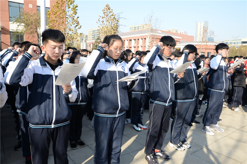 上午9时40分,近四千名师生齐聚大德广场,共同参与“国家宪法日”主题升旗仪式。当国旗冉冉升起,全体同学面向国旗,高唱国歌,表情肃穆而庄重。升旗仪式结束后,同学们集体诵读《宪法》序言部分,用心体会宪法的庄严与神圣。郎朗诵读声,昭示着在场的每一位同学将在心中厚植宪法和法治意识,明确宪法最高的法律地位和法律权威,勇敢承担起弘扬宪法精神的神圣使命。诵读结束后,在学生会主席的带领下,全体同学紧握右拳,举行了庄严的宪法宣誓活动,一声声铿锵有力的誓言响彻整个校园,久久不息……