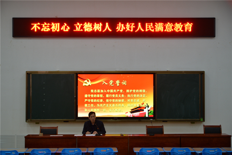 “我志愿加入中国共产党,拥护党的纲领,遵守党的章程,履行党员义务……”会议开始前,全体党员在刘兴旺主任的带领下,全体起立,举起右手,进行了庄严地入党誓词宣誓,再一次重温入党初心,牢记光荣使命。 随后,董建水以“全面从严治党、狠抓工作落实、打造卓越品牌”为题做专题党课,号召全体党员做到讲政治、有信念,讲规矩、有纪律,讲道德、有品行,讲奉献、有作为,充分发挥先锋模范作用和引领带头作用,为学校发展做出新的贡献。