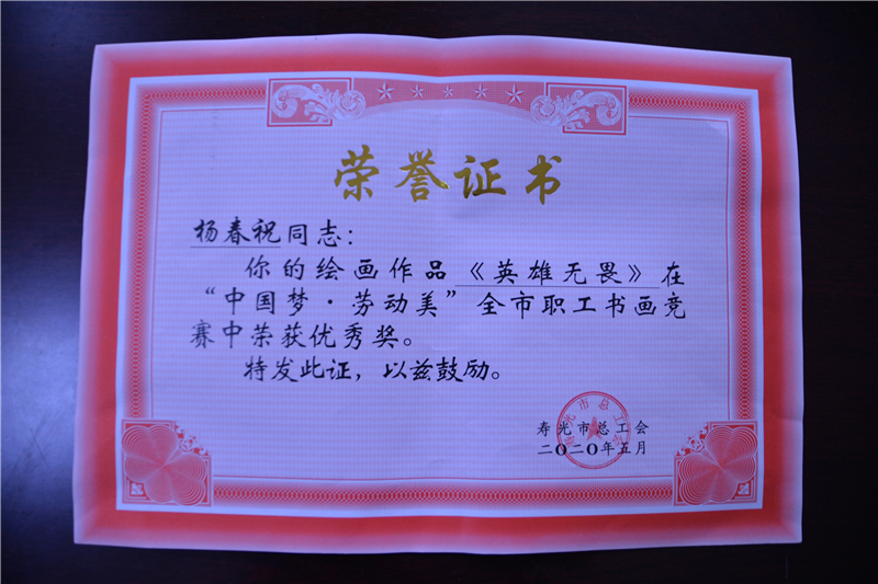 (杨春祝老师的书画作品《英雄无畏》荣获优秀奖)