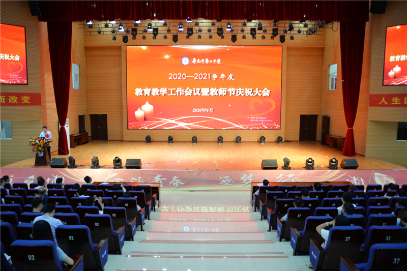 大会在嘹亮的国歌声中拉开帷幕,锡洪武副校长宣读2019—2020学年度获奖教师名单,会场响起了热烈的掌声。上一学年,是一个漫长而又特殊的学年,全体教师在超长寒假中开启了“你若在线,我必相随”的线上教学新模式,高三教师更是经历了前所未有的封闭教学工作,很多老师舍小家、顾大家,全身心投入到教学抗疫一线……当高考的捷报和各类喜讯传来之时,相信每位教师对“幸福都是奋斗出来的”会有更加深刻的理解。
