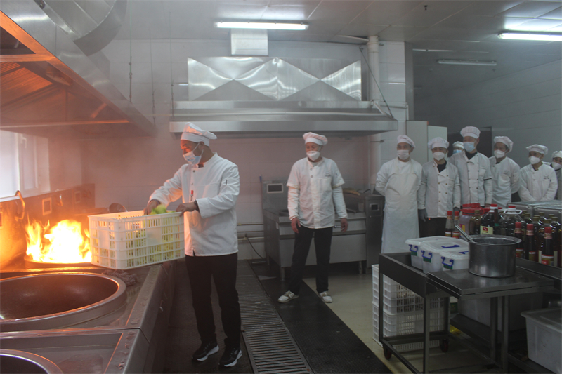 厨房油锅着火,考验着工作人员的应急处理能力。在演练过程中,随着炒菜锅冒起熊熊火焰,厨师沉着冷静,随手拿起附近的一筐菜叶倒入锅中,火源在短时间内被迅速扑灭。此外厨师还现场模拟了使用灭火毯等消防用品进行油锅灭火。