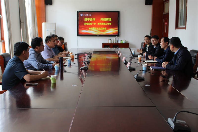 交流活动中,董建水校长对济南历城一中各位领导的到来表示热烈欢迎,他简要介绍了学校的概况和发展历程,希望两所学校在以后的教育教学工作中进一步加强交流沟通,并肩携手,共创辉煌。校长助理、高一级部主任王令成介绍了寿光二中在教育教学、学校文化、考核评价等方面的做法。随后,双方就一些共同感兴趣的话题展开深入交流和探讨。