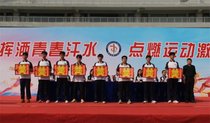 学校党委委员、副校长王令成,党委委员、副校长朱洪周分别为获得体育道德风尚奖、团体总分前八名的班级代表颁发奖状。台上获奖代表手捧奖状,脸上洋溢着自豪的笑容;台下师生掌声雷动,共同分享这份属于集体的荣光。这一刻,掌声、笑声、欢呼声汇聚成欢乐的海洋,是对拼搏者最好的礼赞。