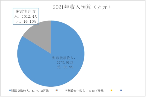 2021年收入预算为6288.33万元,其中:财政拨款5275.93万元,占83.9%,财政专户管理资金1012.4万元,占16.1%,上年结转0万元,占0%。