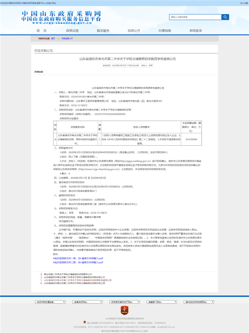 附:寿光市第二中学2020年关于学校北墙维修的采购竞争性磋商公告链接http://www.ccgp-shandong.gov.cn/sdgp2017/site/listcontnew.jsp?colcode=0303&id=201448237